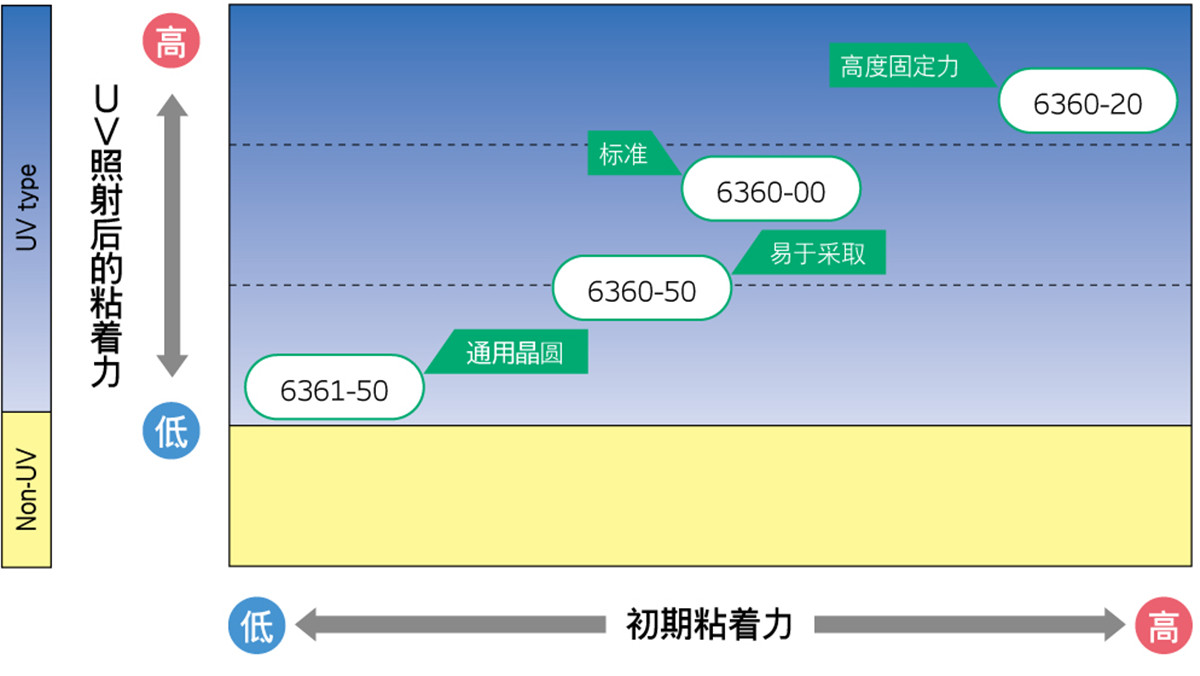 粘著力:(2.6N/10mm, UV硬化后0.10 N/10mm)※在90°剝離條件下進行測量